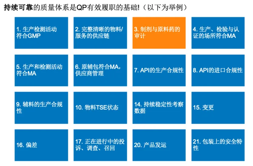 依据EU GMP Annex 16,QP共承担多达21项职责,并需依托持续可靠的质量体系作为履职基础。这意味着,QP必须通过审计等方式,确认所依赖的质量体系处于有效运行状态。