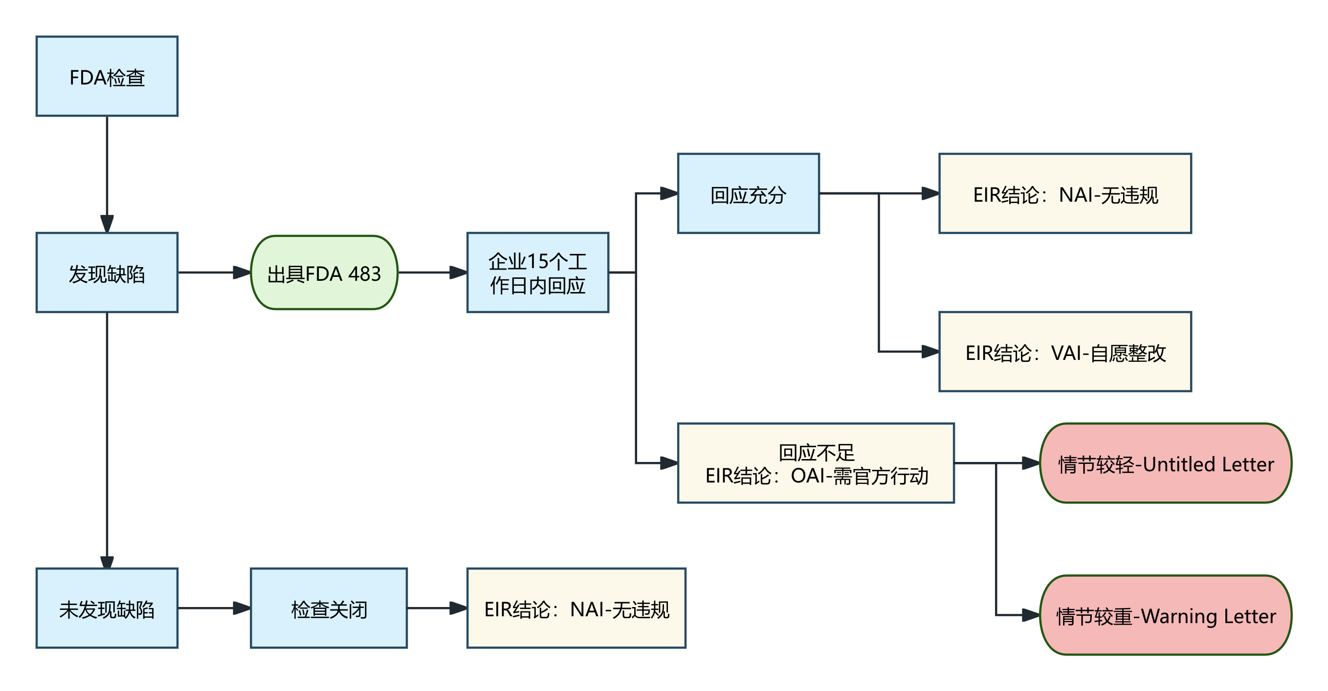 • 收到EIR:重点关注结论分类(NAI/ VAI/OAI),它隐含FDA对企业483回复的接受程度,决定了后续监管走向。