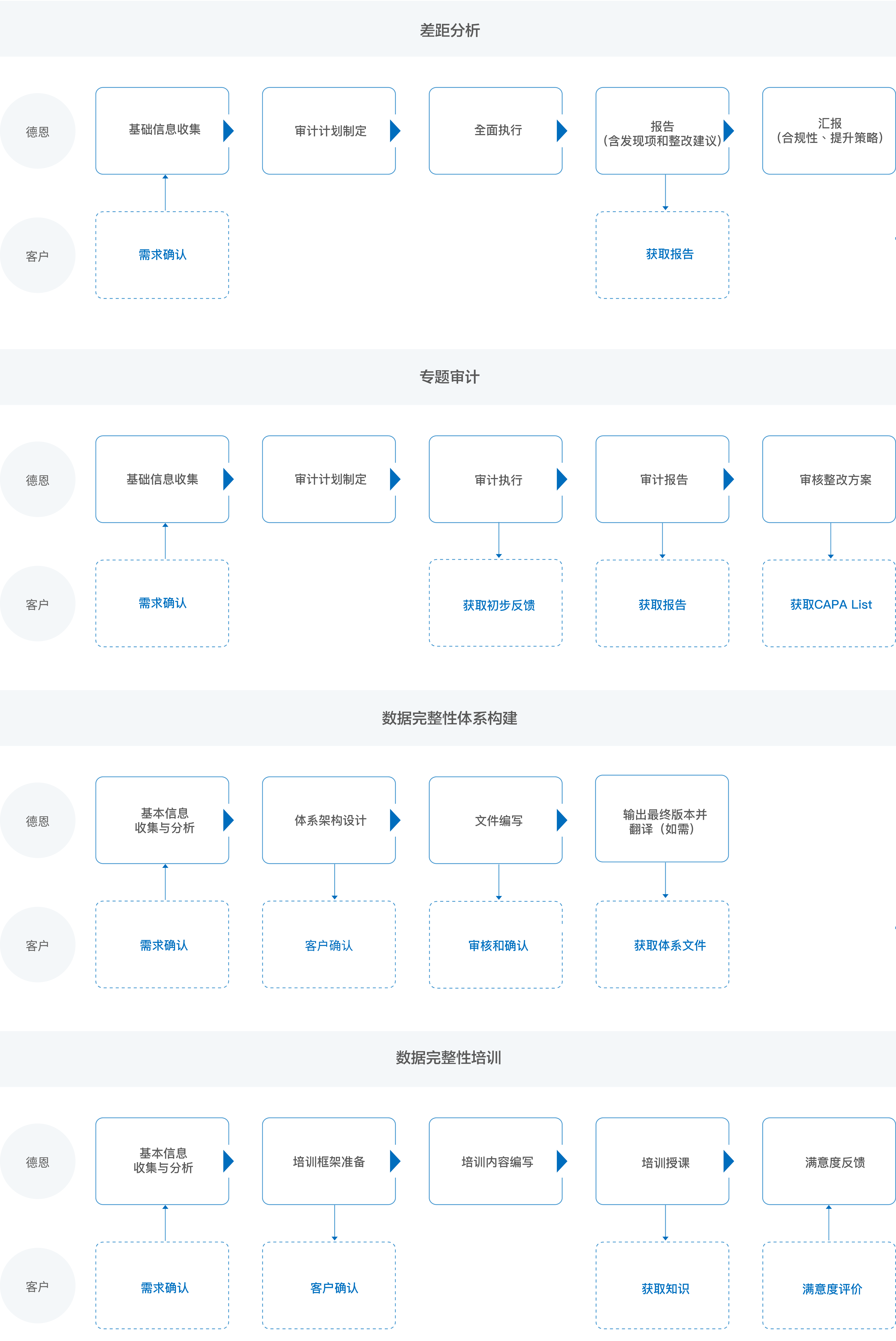 德恩咨询凭借深耕行业20余年的经验,为企业提供全方位、可落地的数据完整性解决方案。我们不仅能精准解读国内外数据可靠性相关法规(如FDA 21 CFR Part 11、EU GMP Annex 11、NMPA《数据管理规范》),更具备将法规要求融入企业实际运营的能力,协助客户构建合规、高效、可持续的数据治理体系。